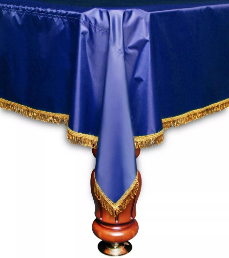 У нас вы можете приобрести специальный чехол для бильярдного стола размером в девять футов. Такой чехол изготовлен из нейлона с влагостойким покрытием. Благодаря такой пропитке ткань не будет пропускать влагу к бильярдному столу. У покрывала синий цвет, а по краю оно украшено жёлтой бахромой, которая делает его еще эстетичнее и наряднее. В целом, такое покрывало подойдет к интерьеру любого бильярдного помещения, будь то клуб или отдельная комната в доме.