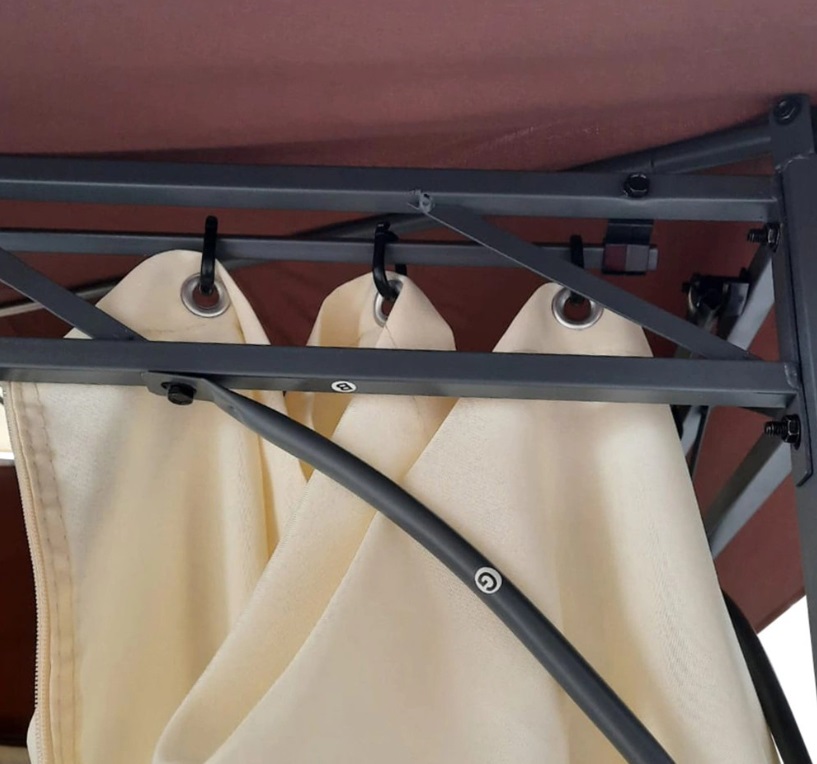 Стенки-шторы крепятся к поперечной балке на кольца, застегиваются на молнии, обеспечивая тень и уединение.