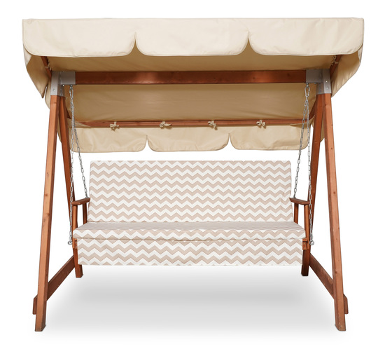 Это цветной матрас, предназначенный для садовых качелей, на него нанесён принт зигзага. Изготовлен данный матрас из европейской ткани с тефлоновым покрытием, в качестве наполнителя используется холлофайбер. Длина изделия составляет 155 см, толщина 5 см, глубина сидения 49 см, а высота спинки 55 см.